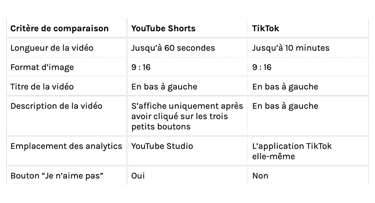 Cependant, plusieurs différences clés distinguent ces deux plateformes. La première différence notable concerne la durée maximum des vidéos ; Actuellement, les YouTube Shorts ne peuvent excéder 60 secondes, tandis que TikTok a récemment étendu la durée maximale à 10 minutes.
