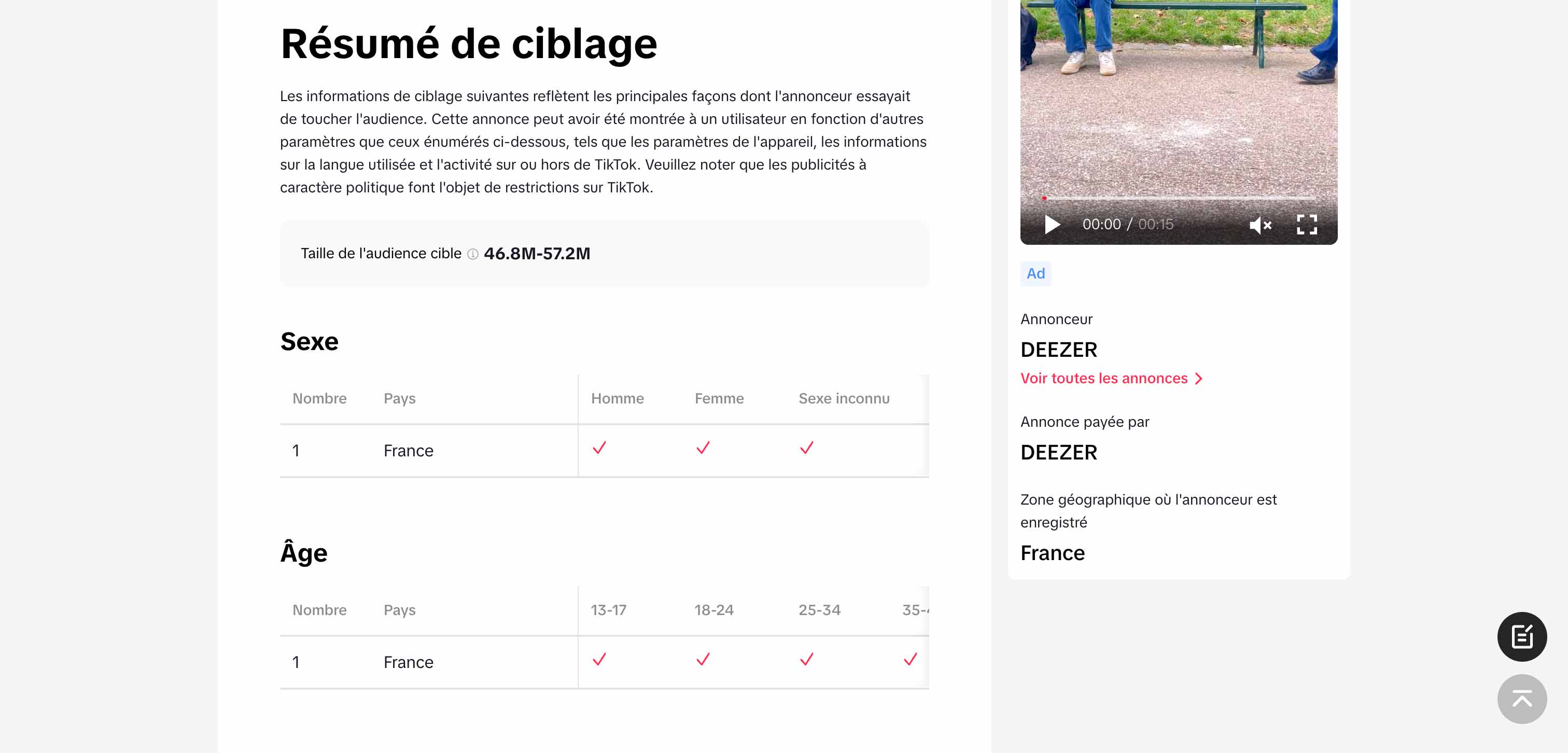 Pour chaque annonce de la bibliothèque publicitaire, un résumé complet avec des chiffres clés sur le ciblage et l'audience est disponible en cliquant sur la vignette de l'annonce :