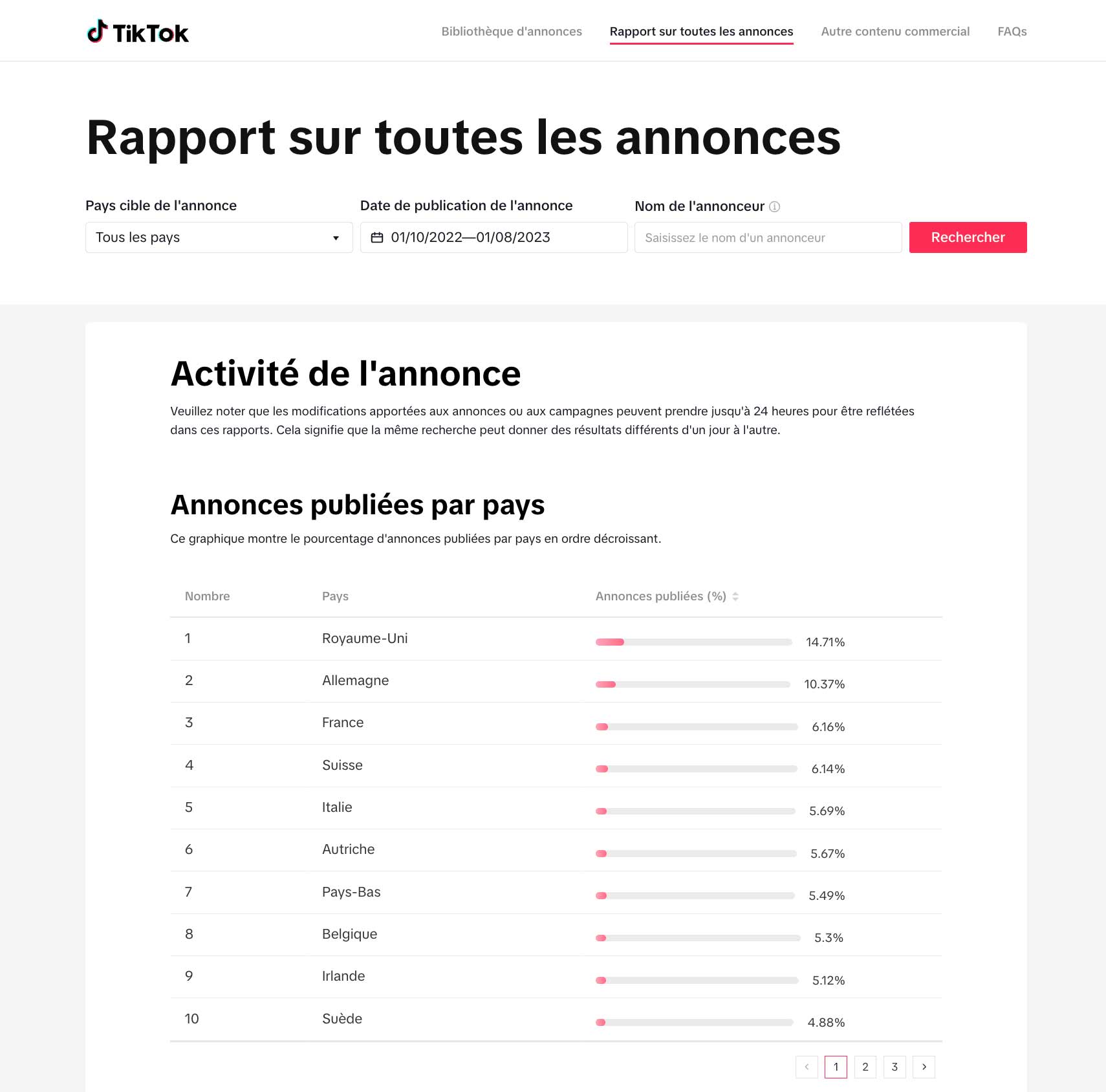 L'onglet "Rapport sur les annonces" est un résumé global des contenus publicitaires de la plateforme TikTok.