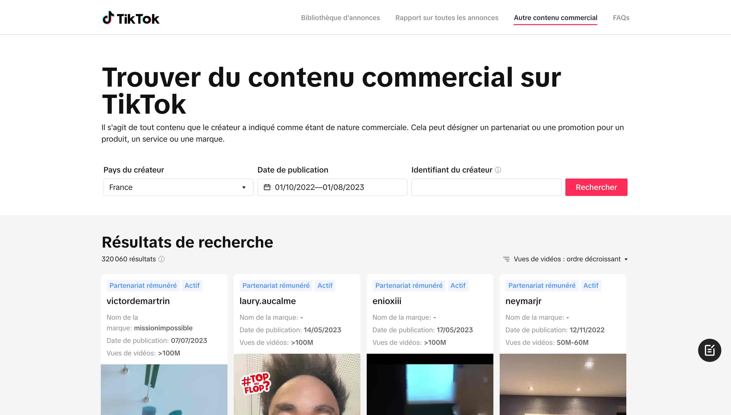 En fonction de leurs performances, notamment le nombre de vues, vous pouvez vous inspirer de leurs paramètres de ciblage pour vos propres campagnes. Que vous soyez une marque à la recherche de données concrètes ou un créateur cherchant à être inspiré par des collaborations réussies, ce catalogue offre une multitude d'informations pertinentes.